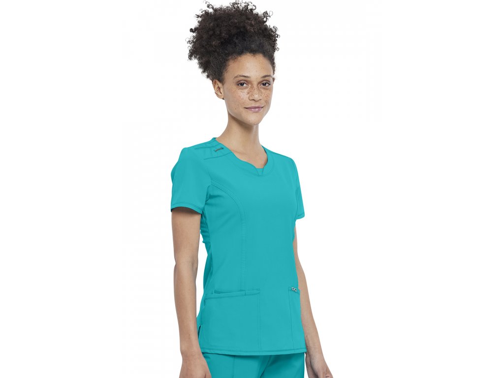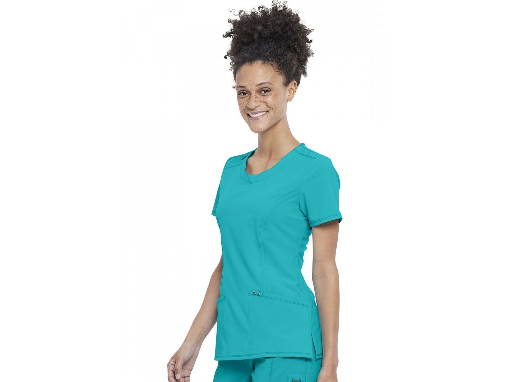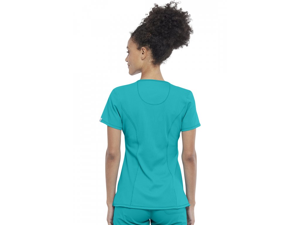 Dámská zdravotnická halena značky Cherokee z kolekce Infinity s kulatým výstřihem v tyrkysové barvě. Halena je mírně projmutá a díky strečovému žebrovému úpletu na zádech má halena zeštíhlující tvar a umožňuje zároveň větší pohyblivost a pohodlí.