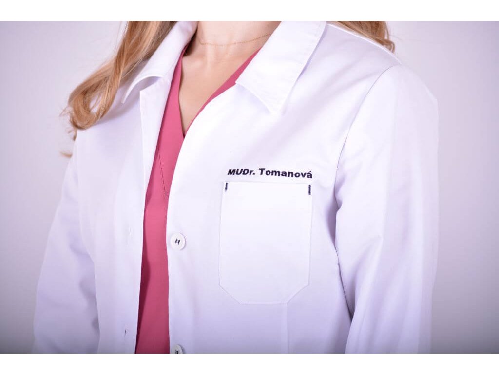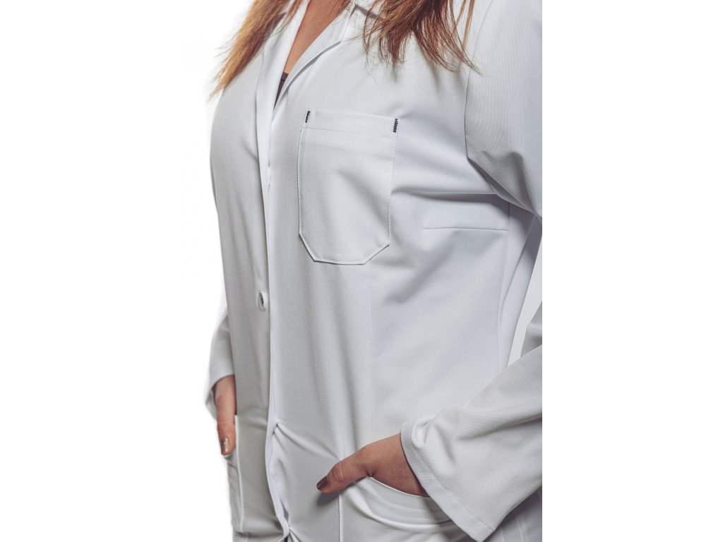 Stylový lékařský plášť se speciální úpravou, designovými detaily a výrazně bílou barvou i při dlouhodobém používání!